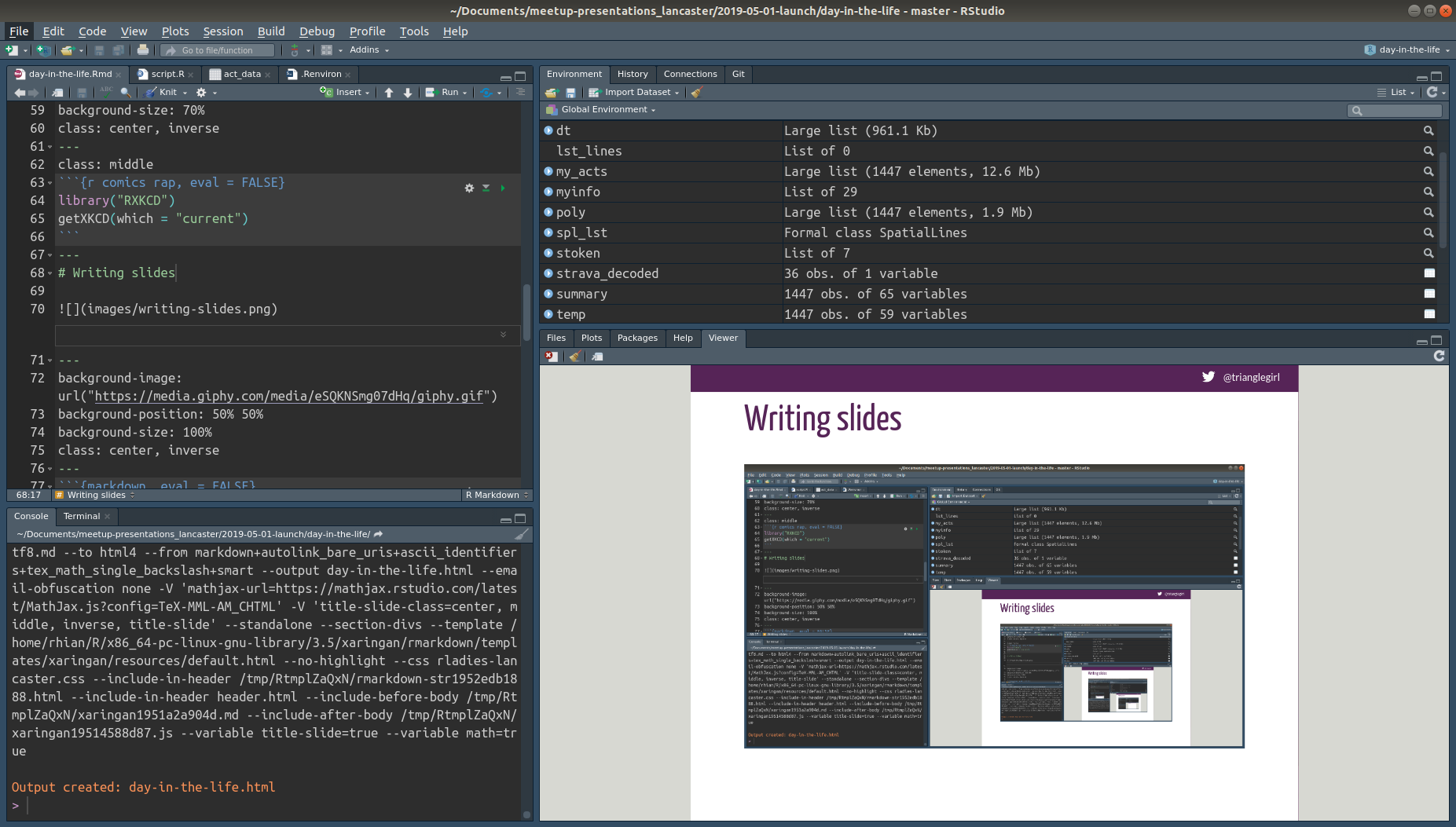--- # Writing slides  --- # Writing slides ```md library("xaringan") --- title: "A day in the life with R" subtitle: "" author: "Rhian Davies ([\\@trianglegirl](https://twitter.com/trianglegirl))" --- # About me  * I love R * I play the triangle * I love pasta ``` --- # Write a blog post ```markdown library("blogdown") blogdown::new_post(title = "Making a blog post in R") --- title: Making a website in R author: '' date: '2019-05-01' slug: making-a-website-in-r categories: [] tags: [] --- # You'll never believe this one cool trick about R Witty, interesting content. ![images/funnypicture.png]() ``` ## [trianglegirl.rbind.io/](http://trianglegirl.rbind.io/post/tidy-tuesday/) --- # Write a C.V ```r library("pagedown") ```  --- background-image: url("https://media.giphy.com/media/eSQKNSmg07dHq/giphy.gif") background-position: 50% 50% background-size: 100% class: center, inverse --- # Bookdown 📖 ```c # Pasta ## Lentil Ragu * 1 onion, finely chopped * 2 carrots, finely chopped * celery finely chopped * 2 garlic cloves, crushed * 250g bag dried red lentils * 400g cans chopped tomatoes * 1 tbsp tomato purée * 1 tsp each dried oregano and thyme * 1 bay leaf * 500ml vegetable stock * 250g spaghetti Heat the oil in a large saucepan and add the onions, carrots, celery and garlic. Cook gently for 15-20 mins until everything is softened. Stir in the lentils, chopped tomatoes, tomato purée, herbs and stock. Bring to a simmer, then cook for 40-50 mins until the lentils are tender and saucy – splash in water if you need. Season. Serve with spaghetti or linguine and cheese. ``` --- background-image: url("images/recipes.png") background-position: 50% 50% background-size: 80% class: center # https://trianglegirl.github.io/recipes/ --- background-image: url("images/netflixR.png") background-position: 50% 50% background-size: 90% class: center, inverse # NetflixR --- class: center, middle, inverse  <a href="https://trianglegirl.rbind.io"><i class="fa fa-link fa-fw"></i> trianglegirl.rbind.io</a><br> <a href="http://twitter.com/trianglegirl"><i class="fa fa-twitter fa-fw"></i> @trianglegirl</a><br> <a href="http://github.com/trianglegirl"><i class="fa fa-github fa-fw"></i> @trianglegirl</a><br>
